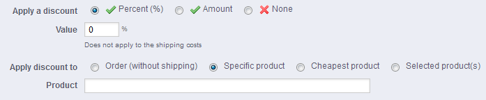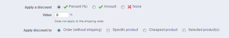 - You will be given a field labeled VALUE. This value is the percentage that you will apply to the purchase, but it can be applied in different ways. Each option is listed above with radial buttons following the label "Apply discount to". They are also defined in the table below: