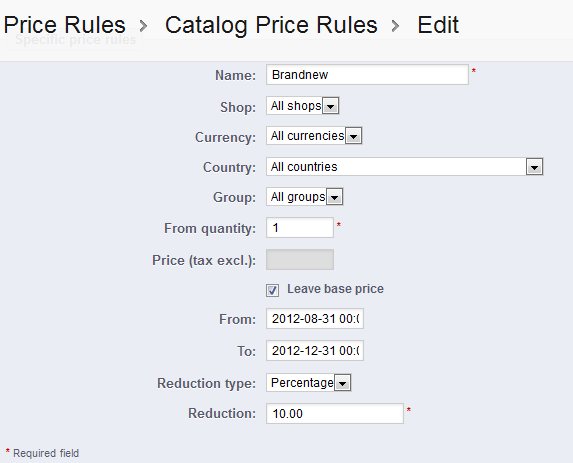 Catalog price rules are discounts that are applied to products, but they can also be assigned to shops, countries, currencies and customer groups. This allows you to apply the discount to a specific set of your customers or a specific geographic location as served by your shops. The following tutorial will show you how to specify where and who can use your catalog price rule in PrestaShop 1.5.