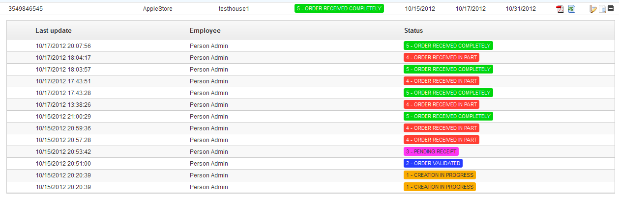 This completes the Supply Order process. You can print a copy of the supply order using the Adobe PDF icon, export the data to CSV, or view the status order in the ACTION column. You can also click on the update status icon again if you find that the order is actually incomplete. This will change the status back to ORDER RECEIVED IN PART. Note that all of the status changes are captured in history for each order. Click on the PLUS sign in the ACTIONS column in order to see the complete status history of the Supply Order. Here's an example of one that can be viewed by the Administrator of the shop. Here's an example of the chart summary: