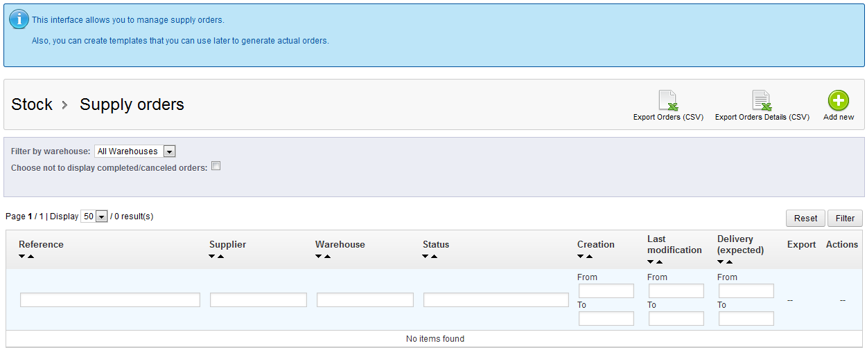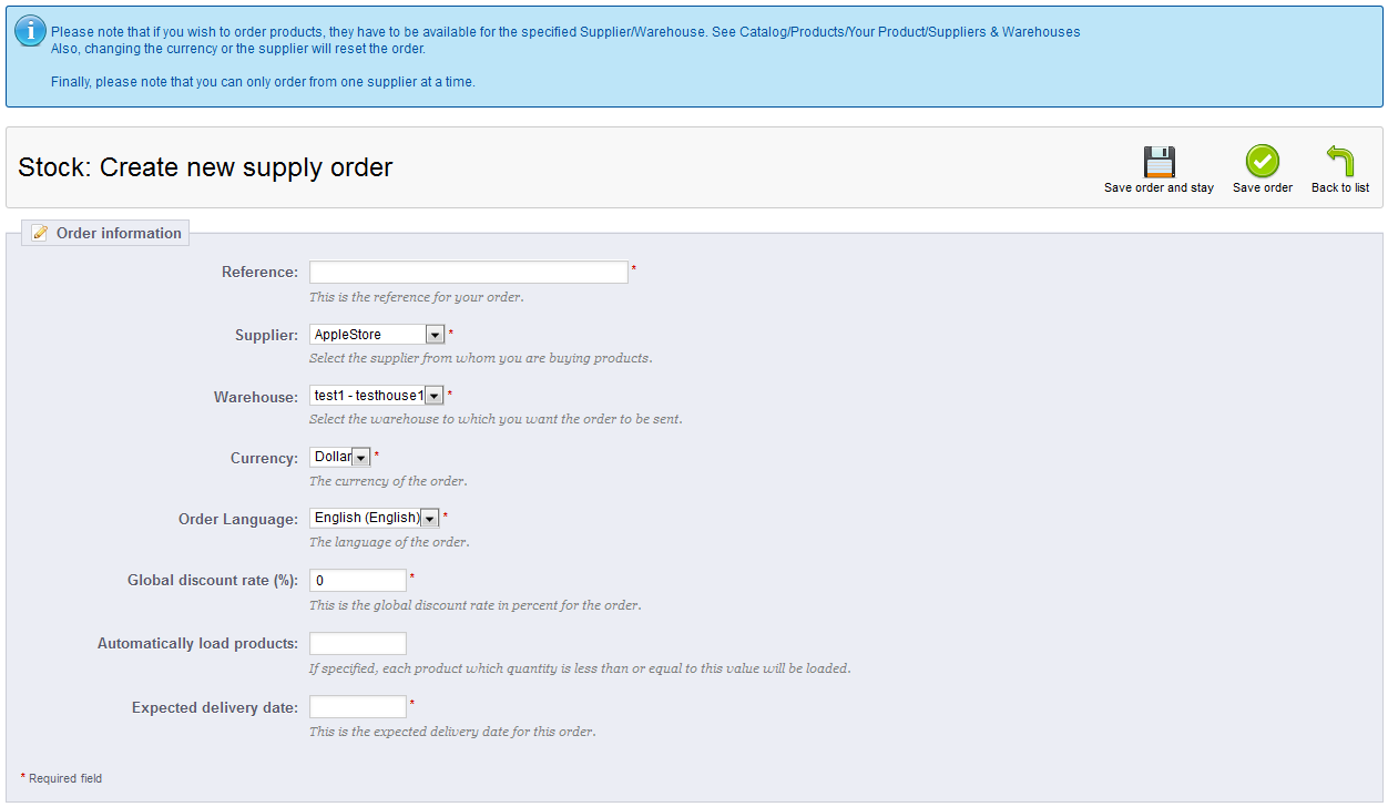 When your reaches a point that requires re-supply, then it may become necessary to issue a supply order. This may be on a regular basis, or, if your sales are booming, however many times as necessary. PrestaShop allows you to issue and track Supply orders through the administrator dashboard. The following tutorial explains how to create a supply order in PrestaShop 1.5.