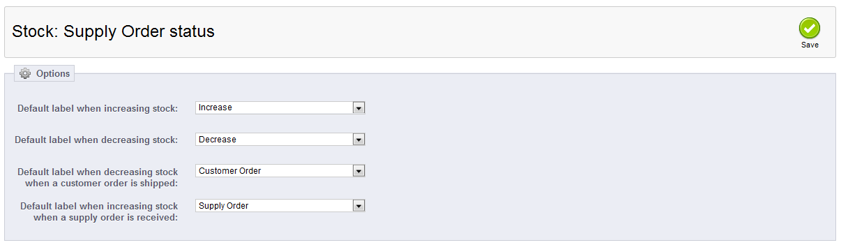 The default values for the Stock: Supply Order status are easily set with the drop-down menus in the interface. Make sure to properly set these values in order account for proper stock movement types in your supply order statuses. See Managing Supply Order Statuses Labels in PrestaShop 1.5 for further information.