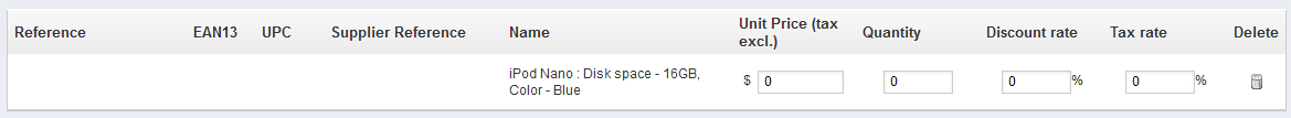 When the product appears you need to click in and fill out the fields (where necessary) for unit price, quantity, discount and tax rate.