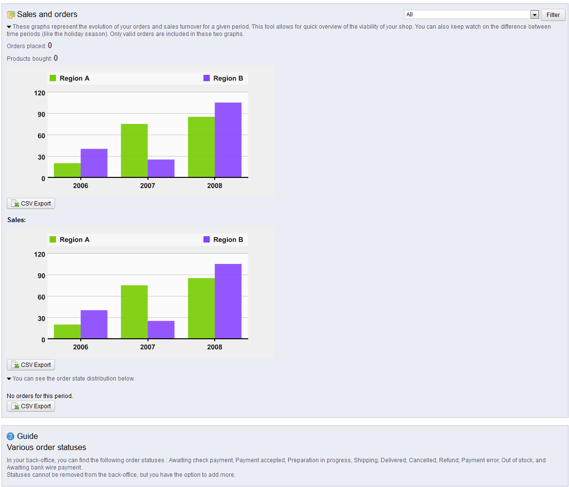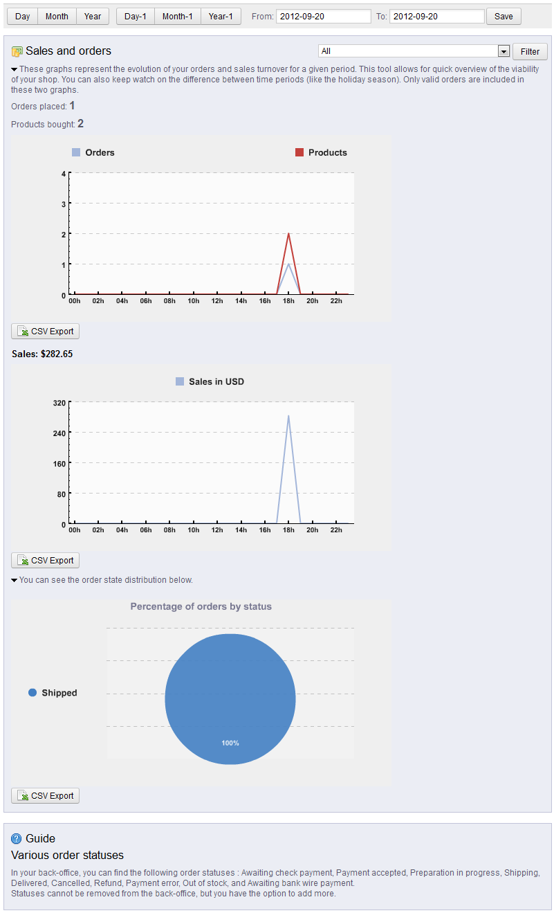 The Sales and Orders report gives you a quick overall view of the rate of your sales for your store - basically, it graphically shows if you store is selling your products. The first graph totals your valid orders and the second graph displays the products that have been selling. For further information on the report options please view the Navigation or Settings for the STATS section of PrestaShop 1.5.