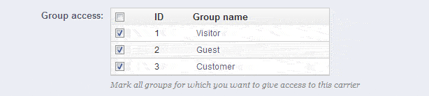 Sometimes costs or other issues may lead you to not make a particular shipping company available to a group of your customers. Prestashop allows you to quickly make assignments for the available carriers. However, show care when removing carriers from a customer group in order to avoid removing all possible carriers from a customer group.