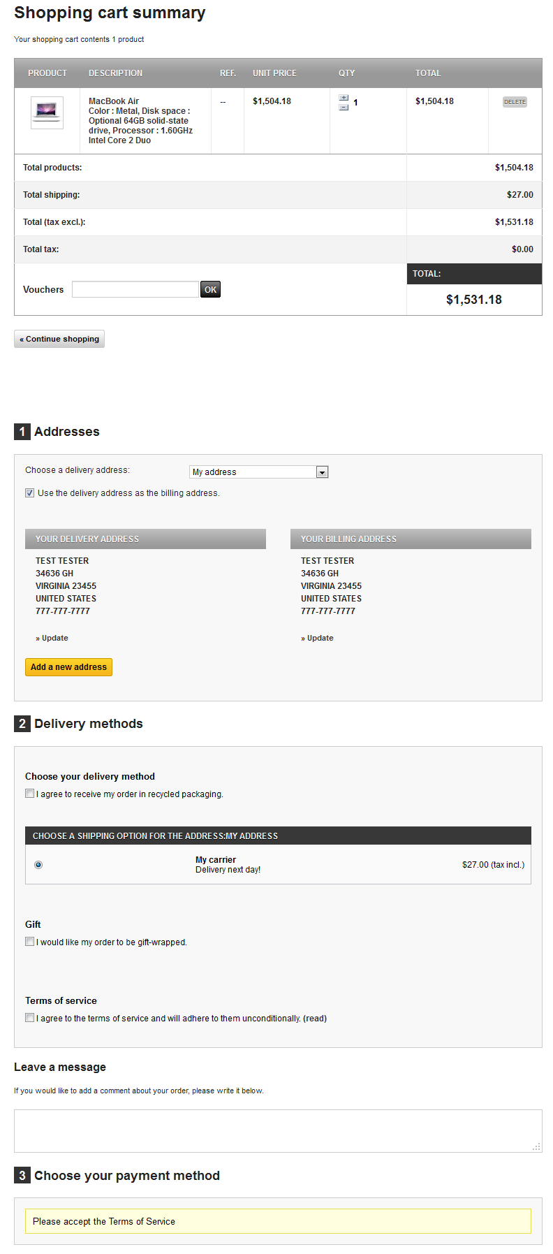 Setting the dimensions for the out-of-range behaviors is important because it allows you to limit the package size supported by your carriers. Make sure to set these values in order to prevent confusion between your customers and shipper. As with all of the out-of-range shipping behaviors, the actual action taken is never seen by the customer except in the amount being paid for shipping. So, when checking out, the customer will see only a typical cart checkout like this: