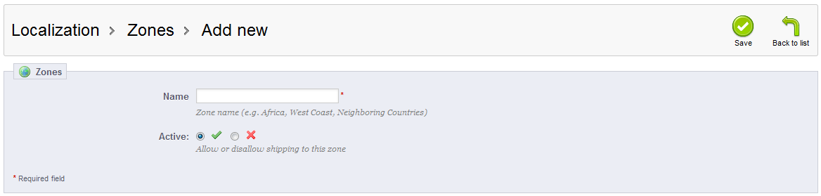 - Give the new zone you are defining a name and then determine if the zone will be active or not by clicking on green check or red 'x' radial buttons. Active zones can be used by your carriers to deliver your products. Click on SAVE to save your entries.