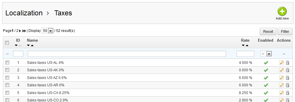 - The TAXES section starts off with a green ADD NEW button in the top right hand corner. On the next line below it, is the filtering options. These alow you determine the number results that you display at once. The RESET button to the right clears these settings, while the FILTER button applies the changes to the results being displayed.