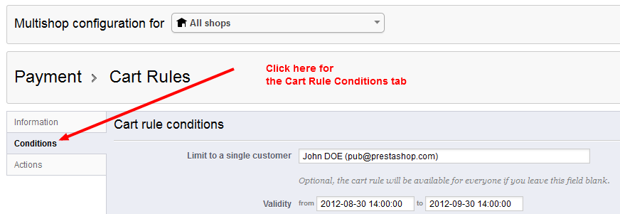 Cart Rules, which are also known as Vouchers or Coupons, can be assigned to a particular customer of your shop using the PrestaShop interface. Use this option to limit who can use your vouchers and coupons as per your customer and shop needs. Not assigning the cart rule means that it will apply to everyone registered to your store. The next option that you can set to limit the use of a voucher or coupon are the conditions based on time. To see more information on this topic, go to Setting the Expiration Date for Vouchers in PrestaShop 1.5.
