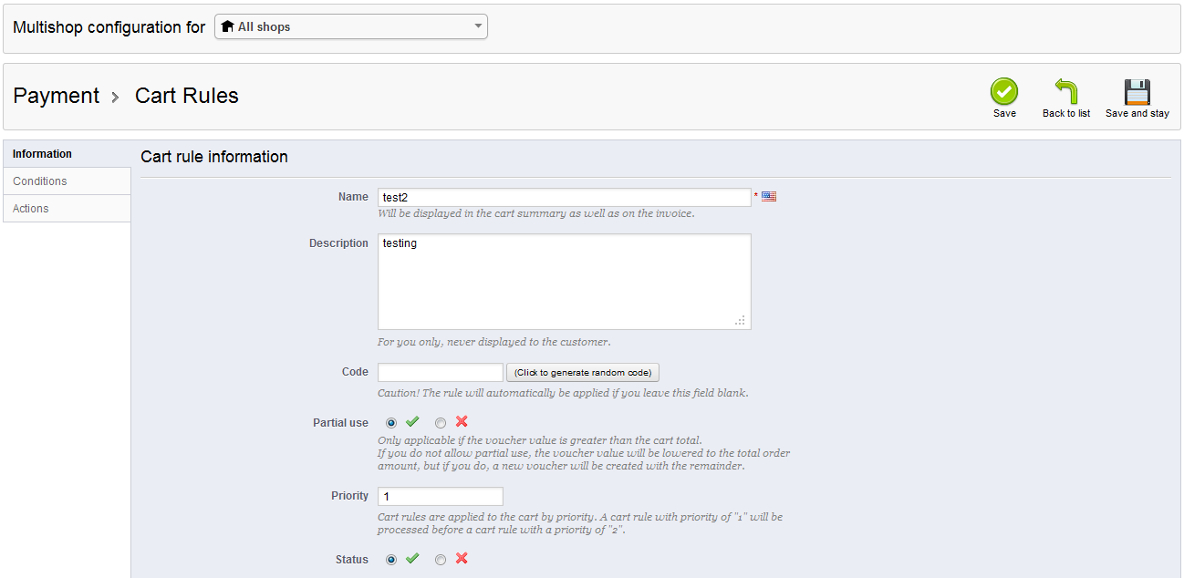 Partial use coupons and vouchers are helpful options to let you give discounts or credit in a controlled fashion. Be careful when using the partial use option in order to maintain a positive outlook from your customers who may have received a voucher for compensation to a negative event. For more information on the following option - Cart Rule Priority, please go to Setting Cart Rule Priority in PrestaShop 1.5.