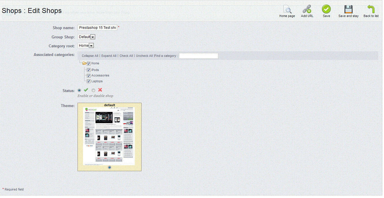 In order to set the status of your shop, first login to the Prestashop 1.5 Administration Panel as an administrator. Then go to the far right side of the screen and select SHOPS. You will get a drop-down menu that will also have a SHOPS option. Click on it to view the Shops list. By default, there will be one shop created. If you are dealing with more than one shop, select the shop that you wish to enable or disable and then click on the EDIT SHOP icon at the far right side of the screen. You will then see the EDIT SHOPS screen below: