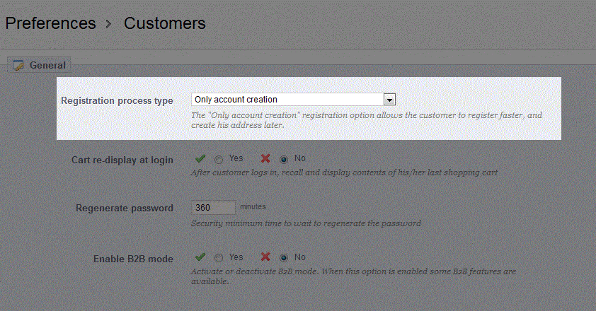 You can speed up the registration process by changing the registration type for Prestashop 1.5 . To do this, you can set the registration process type to either "Only account creation" or "Standard" account creation. The following tutorial will guide you in selecting the registration option that you wish to use. To return to the preceding course, please click on Adding New Admins / Employee Users in PrestaShop 1.5.