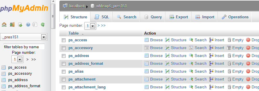 - Select the database that is being used for your PrestaShop installation. Click on it, and you will see all of the tables listed for the application. You will need to specifically look for the ps_employee table.