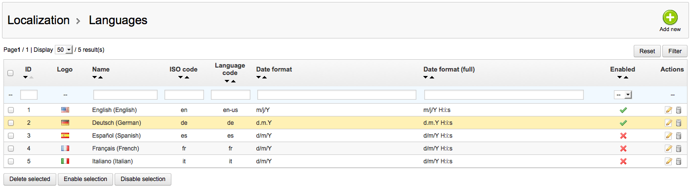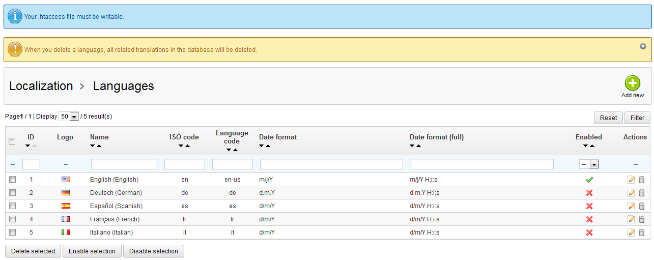 - If you intend to remove, enable or disable a language from the list of languages loaded for your site, then click on the check box to the left, and then at the bottom of the table select the corresponding button: