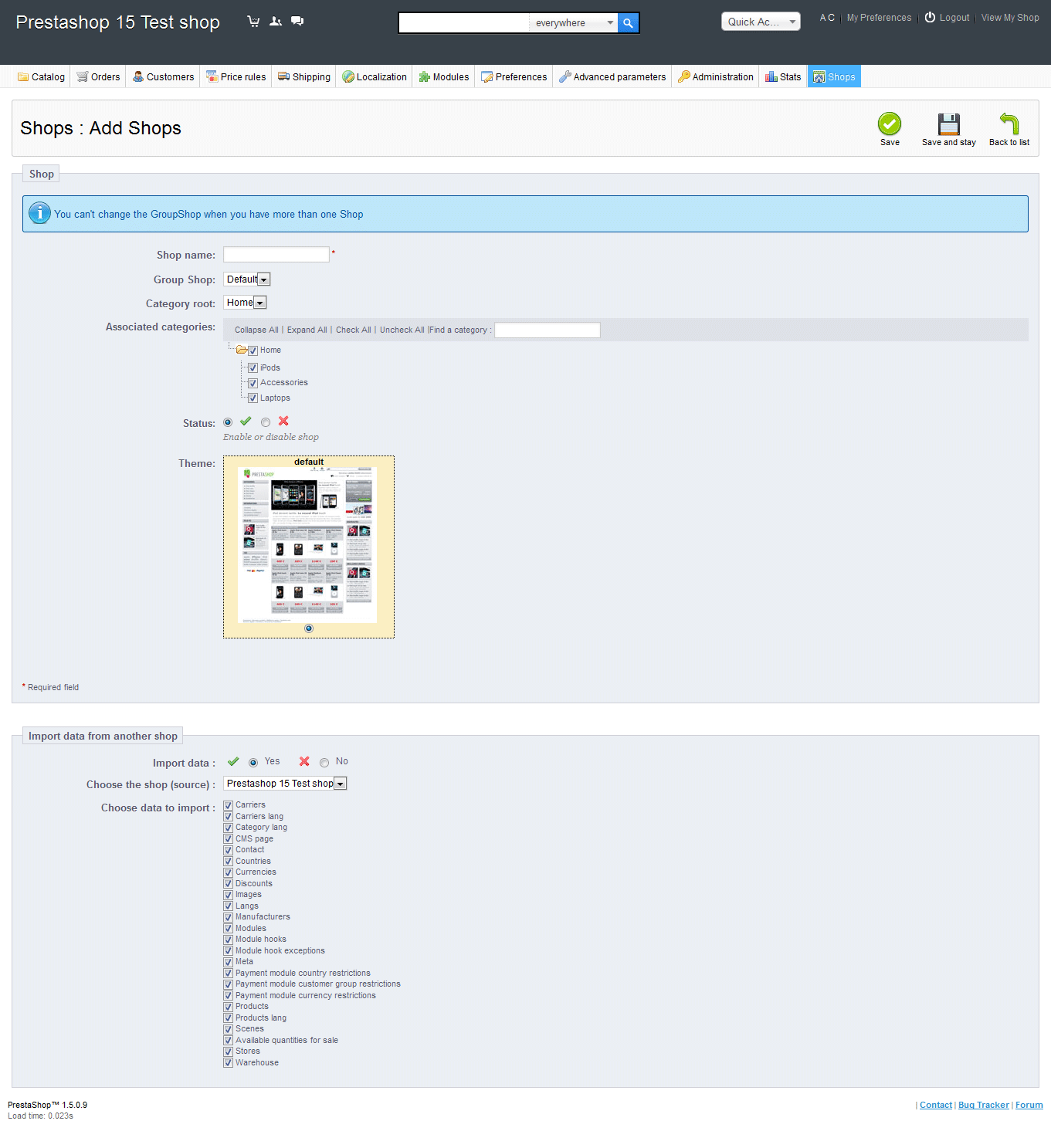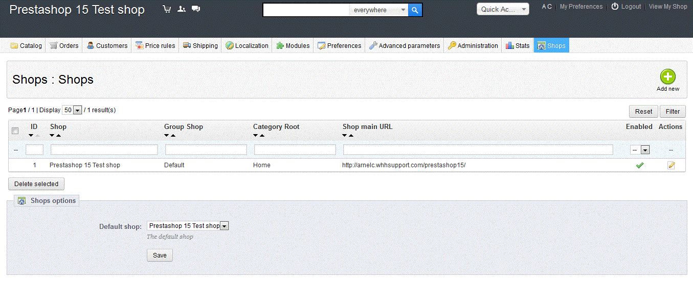 Setting up a shop in Prestashop 1.5 is a simple task that can be found under the menu item called SHOPS. PrestaShop allows you to manage multiple shops at once. This tutorial we will guide you through the setup of one additional shop. By default, there will be one shop already created and it will be used as the template for the creation of the additional shop.