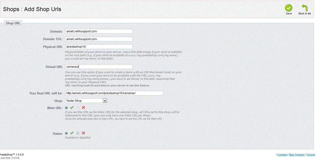 Select SAVE to commit the URL that will be used for the shop and you have completed the steps for adding a new shop to PrestaShop 1.5!