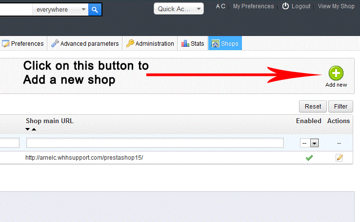 In order to add a shop, you need to first login to the Prestashop Administration Panel as an Administrator. Go to the far right end of the menu bar and select SHOPS. You will get a drop-down menu with th 3 choices. Select SHOPS from the menu and then follow the steps listed below: