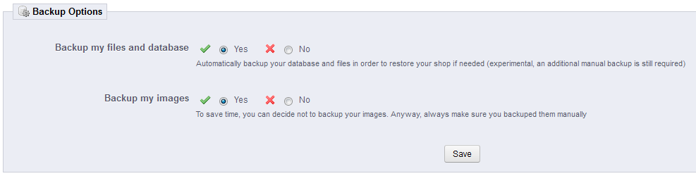 The options presented by the Backup Options allow you to choose to automatically backup shop database and files, or to simply save the images. Even with these options (and note that PrestaShop labels the first option as "experimental"), you should manually backup your installation so that you can restore the files if something goes wrong. The SAVE button simply save your backup option selections.