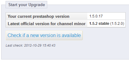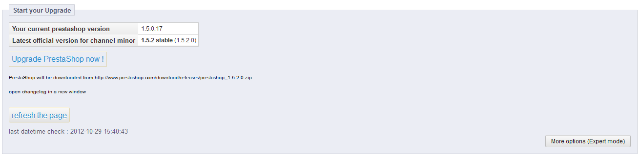 This section has a few details that should be noted. It starts with the current PrestaShop version (1.5.0.17) and compares it to the latest release (1.5.2.0). If the pre-Upgrade checklist requirements have been met then you will see the UPGRADE PRESTASHOP NOW button below the version comparison. Note the options in tiny print: Prestashop will be downloaded from http://www.prestashop.com/download/releases/prestashop_1.5.2.0.zip and there is an option to open the changelog in a separate window. This information is important in that it tells you that the upgrade files are coming directly from PrestaShop's website. Therefore, your connection to the internet should not be overly slow or interrupted. You can also view the changes that have been made with the latest version. Below these items, you have a REFRESH THE PAGE option which will update the datetime check as well as the version comparison section which is detailed below. EXPERT MODE Note that there is also an EXPERT MODE button in the bottom right hand corner of this section. Here's what you will see if you click on this button: |