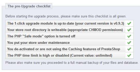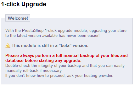 The 1-Click upgrade process simplifies many of the processes by consolidating them into a list in the configuration screens for the module. This configuration screen contains many items that require explanation so that you can make the proper decision on the setting. The following article explains the configuration screen of the 1-Click Upgrade module in PrestaShop 1.5.