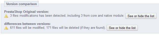 The version comparison section simply compares the files in regards to the existing version and also the actual differences between the version to which it will be upgraded. You have the option to view the list. This is especially useful if there are custom files being used so that they can be quickly identified and manually changed as necessary.