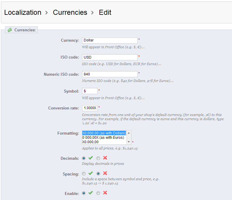 Editing a currency may involve something as simple as changing format for the way the currency appears, but to your customers these details are important. PrestaShop also allows you to disable or delete currencies. Choose each option with care per the needs of your store and your customers.