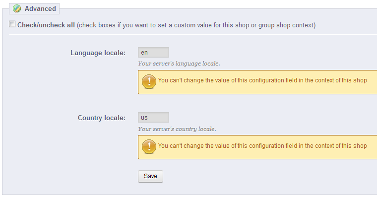 The ADVANCED section is anchored by the server Language and Country settings. For further information on this section go to Advanced Localization Settings in PrestaShop 1.5.
