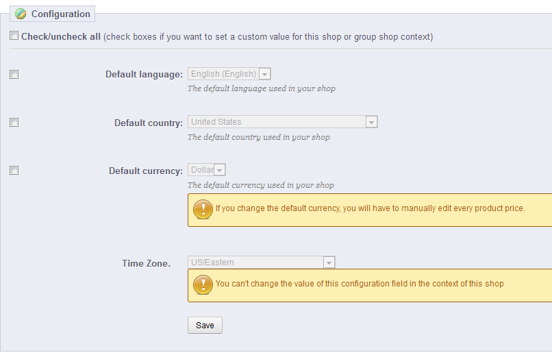 - Scroll to the next section labeled CONFIGURATION - for more information on using this option, please go to Setting the Regional Configuration Settings in PrestaShop 1.5