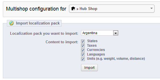 - Scroll to the first section at the top of the screen - IMPORT LOCALIZATION PACK - for further information on this section go to Importing Localization Packs in PrestaShop 1.5.