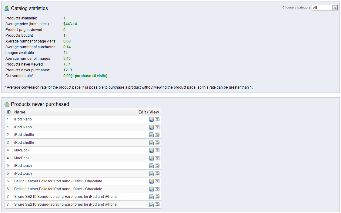 The CATALOG STATISTICS report is a category specific report which helps you focus on all of your products in the store. This allows you to pinpoint your successes and the products that are not selling. Adjust your marketing, product inventory, and store policies based on what you find these reports to help move your store in a positive directions. Go to the Introduction to the Stats Page in PrestaShop 1.5 for further information about the STATS section.
