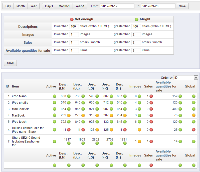 This report is an analysis of the catalog used to describe your inventory. You are able to set criteria for how many characters that your descriptions should contain and the number of images used. And this is compared against sales and available inventory. This data helps to correlate your descriptions in the catalog with how the product is selling. You can identify possible changes in description (in all languages) and determine if you should make changes that may help to increase the sales of that item. Use this data to carefully analyze your catalog and determine where some descriptions and images may help to improve your sales. For more information on changing or reviewing the catalog text and values, go to How to use Catalog Attributes and Values in PrestaShop 1.5.