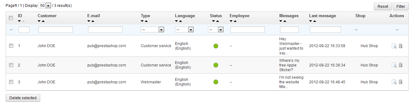 - In the screen above you will see boxes for the Webmaster and Customer Service. For more information on adding these contacts to your store, see Managing Customer Contacts in Prestashop 1.5. Each of the boxes above have a line indicating the number of messages sent to each contact. This number of messages will remain a new message as long as the STATUS of the message has not been changed. Notice that the STATUS list is displayed next to the contact box summaries. You can quickly see the message per box by simply clicking on the line that reads "1 new message" or "2 new messages." You will see something similar to the following:
