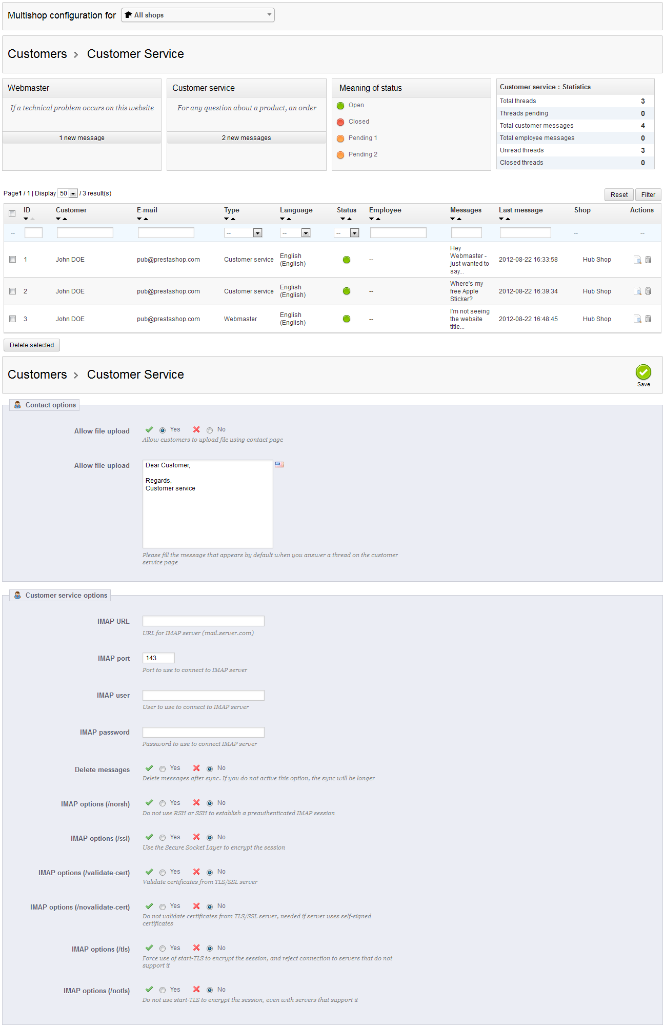 Customer Service messages can be sent to and then viewed by the webmaster, customer support, sales people, managers or whoever you designate to be able to receive messages in your Prestashop store. These messages can be sent via email to each recipient, or managed in a central location - CUSTOMER SERVICE. The following tutorial shows how to view the messages that appear in Customer Service for PrestaShop 1.5.