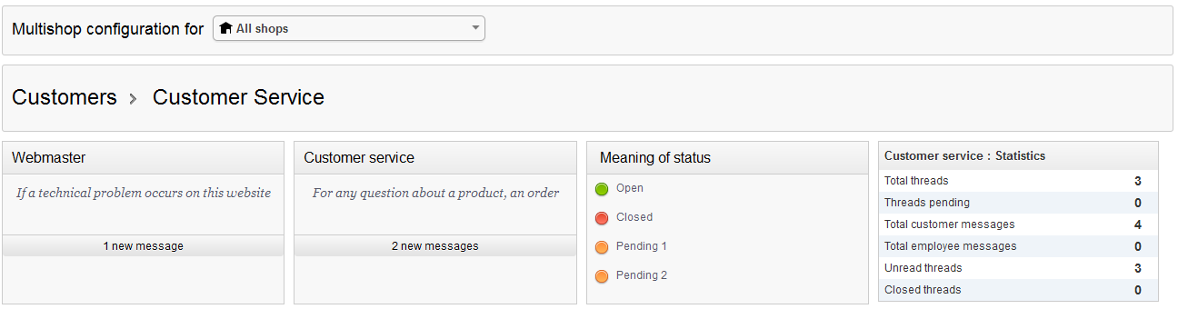The Customer Service section of the PrestaShop administrator centralizes communications being sent to the owner or administrator of the storefront. Use the feedback sent from the customer to make appropriate actions that may affect your website or the store itself.