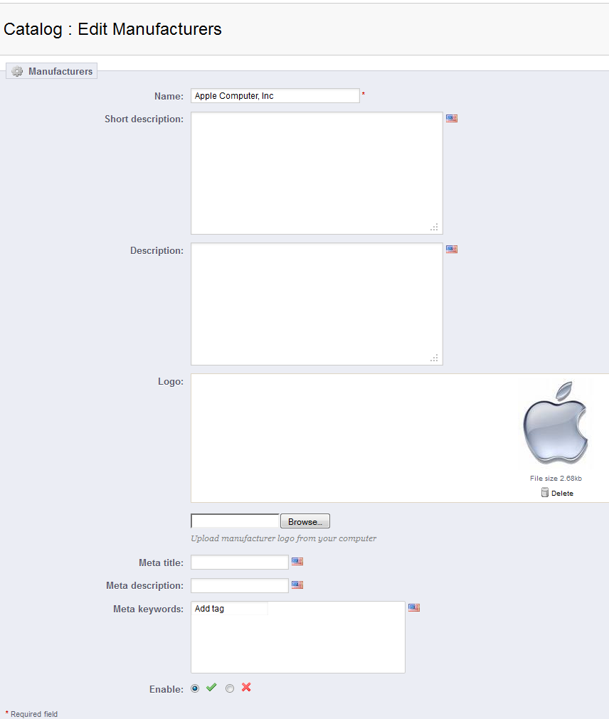 The only required field is the manufacturer name, but a good logo and description are important as well. Additionally, META data including the title, description, and keywords help your content to be searched in association with the manufacturer name. If you need to disable the manufacturer, select the 'x' a the bottom of the screen.
