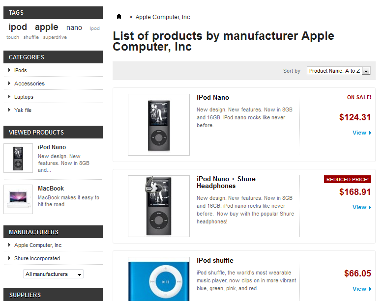 Manufacturers is a quick way to provide established company reputations and identification of products within your store. You can often see these as sort or search options within the shop. Here's an example of a shop with a manufacturer identification present: