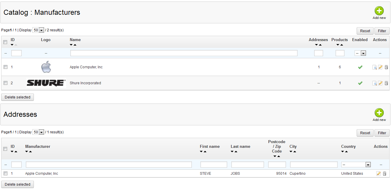 The MANUFACTURERS section is divided into two main areas: MANUFACTURERS and ADDRESSES. The Manufacturers section identifies the company by name and also includes a logo. It also includes the number addresses associated with that particular manufacturer, the number products under that particular company name, and if the manufacturer is enabled in the store. If you wish to EDIT an existing manufacturer, you can select EDIT here to manipulate the existing entry.