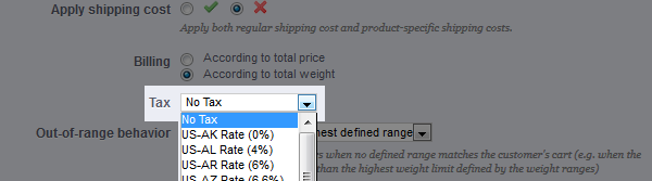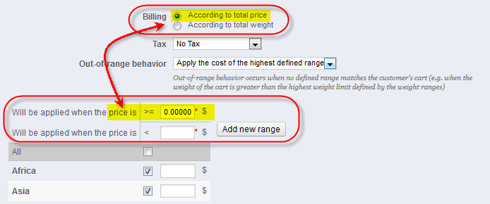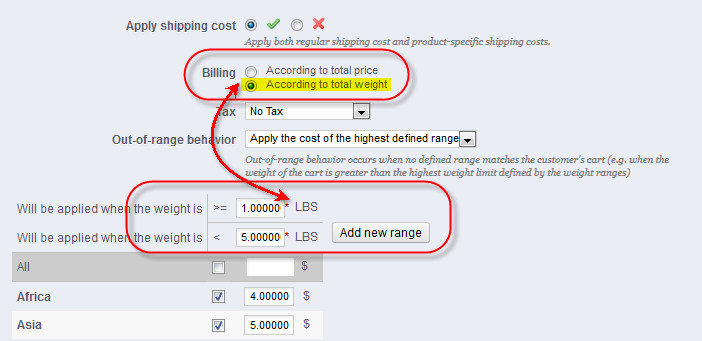 This setting determines if the range for shipping and handling cost will be based on price or by weight. Review the screenshots at right. Each screenshot shows how changing the billing option to price or weight will affect the setting.
