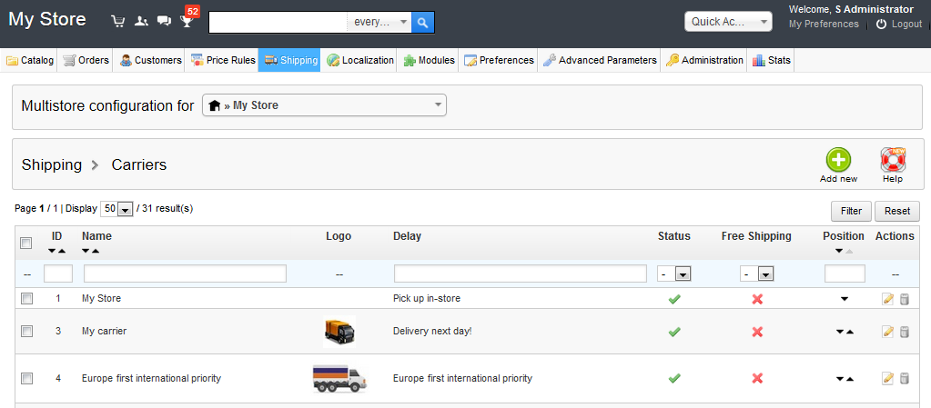 Before you add a carrier, let's get familiar with the Carrier list screen. It has a few functions that are helpful to manage the carriers that you create. The functions of the Carrier list include the options to enable/disable a carrier, enable/disable free shipping, and delete a carrier. Each of these functions are represented by icons in columns to the right of the screen. These columns are respectively labeled: Status, Free Shipping, Actions. To perform each function, simply click on the icon corresponding to the carrier in the list. The other thing you can do with the screen is determine the order in which the Shippers appear. In the column labeled Position, you can click on the up or down arrow to change the position of that carrier.