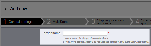 Once you have clicked on the Add new button, you will be able to start the process of setting up the details for your carrier. Each section of the carrier you are creating is described below. As you click on each section, you will need to fill in the values that apply to your carrier. You will find that you may need to create multiple carriers based on the products that you ship and shipping services that you wish to offer. Click on the items below in order to learn about each section of the Carrier creation process.