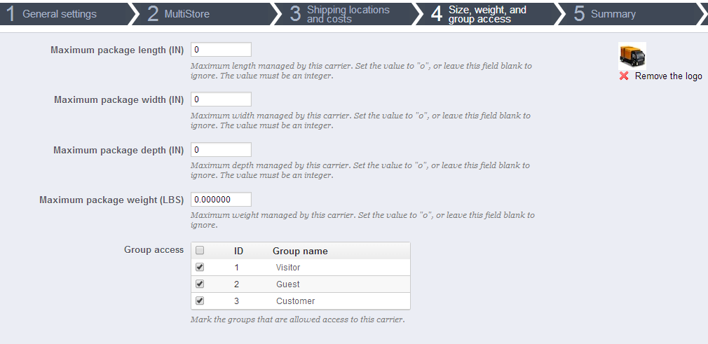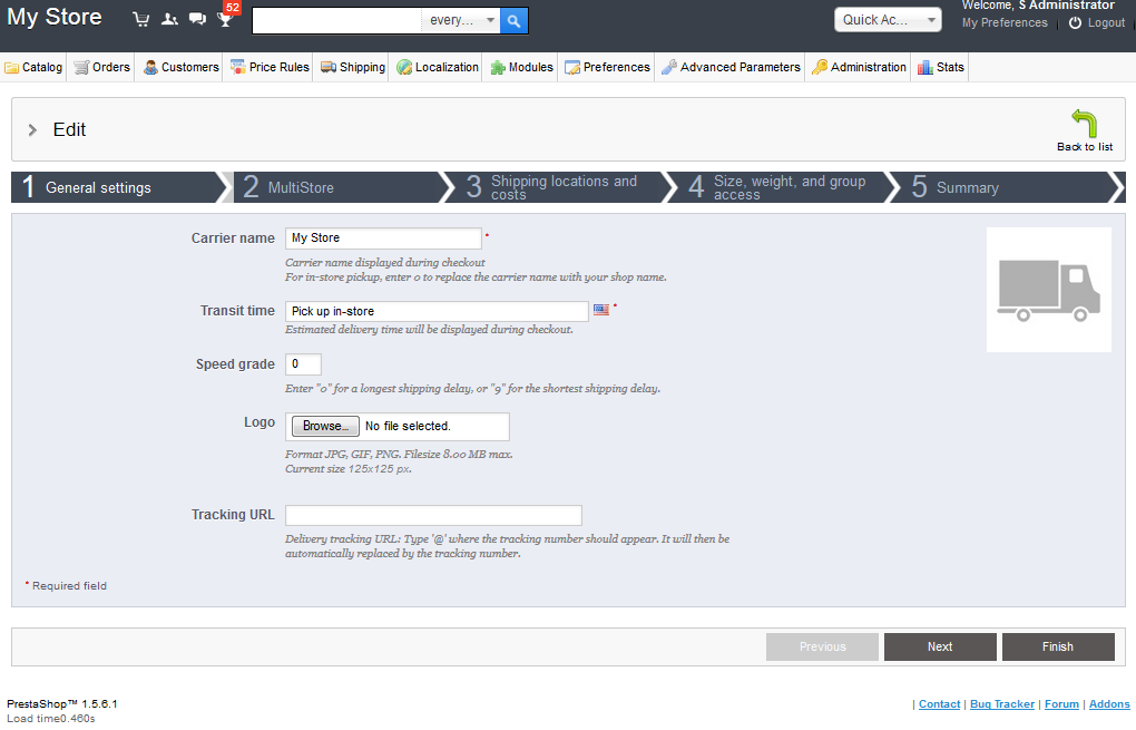 The add carrier interface has been updated in PrestaShop versions 1.55 and above. It updates functionality for adding a carrier using a wizard interface. When you use the interface it "slides" to the left and right but will not let you advance until you have completed the mandatory items. The following tutorial introduces you to the carrier list interface and the Add Carrier Wizard.