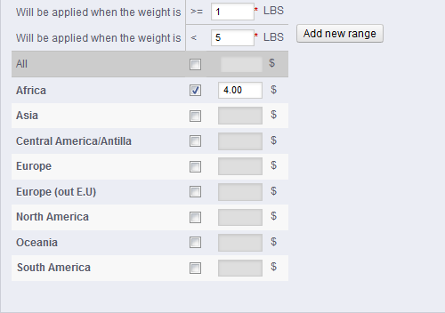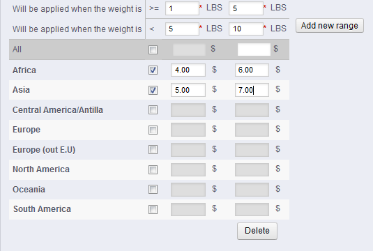 This area of the interface allows you to define your carrier cost of shipping and handling based on a weight/price range. It allows you to define a single cost for all regions or you can define a shipping cost per each region. You can also define multiple costs based on different weight/price ranges.