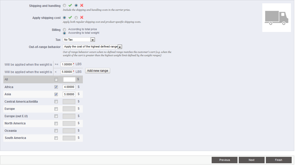 This section defines the delivery locations for your carrier. It also defines the handling costs. The shipping and handling costs are based on either price or weight of the items purchased. You can define this by setting up a range and you can also set up different cost per region.