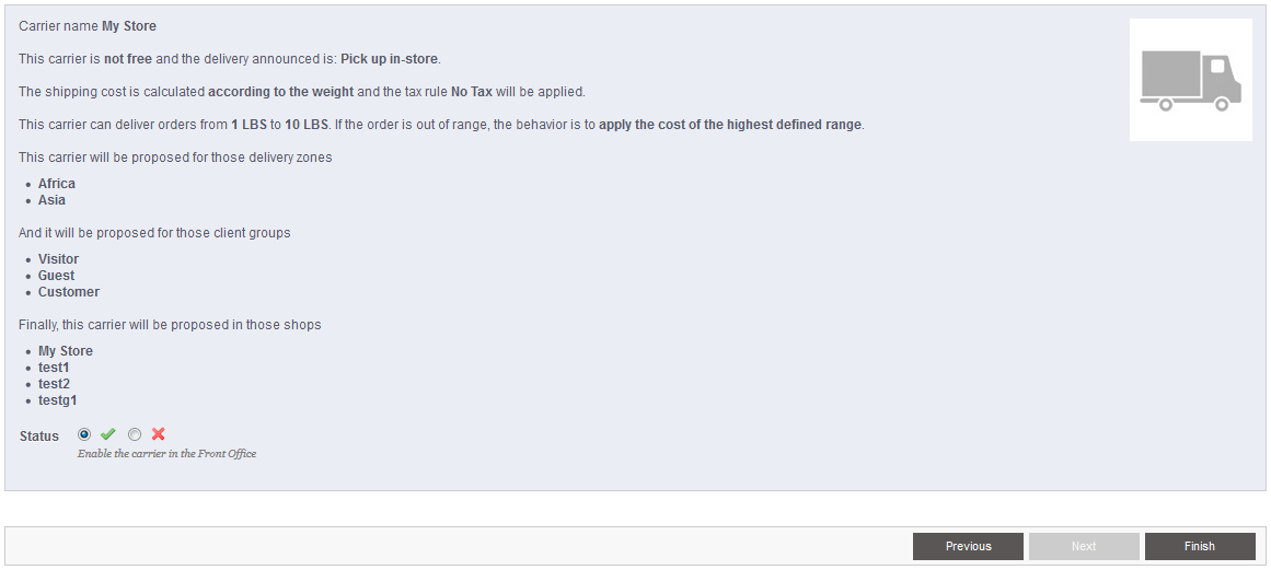 The Summary screen is exactly that - a summary of all of the settings that you have added. You can also set the carrier to be disabled here so that you don't have to take that extra step in the carrier list. Click on the FINISH button after you have finished reviewing your settings in order to save the newly created/edited carrier.