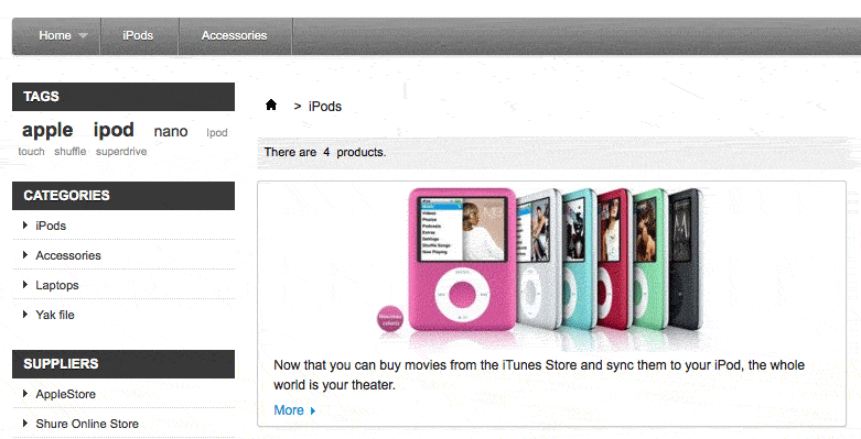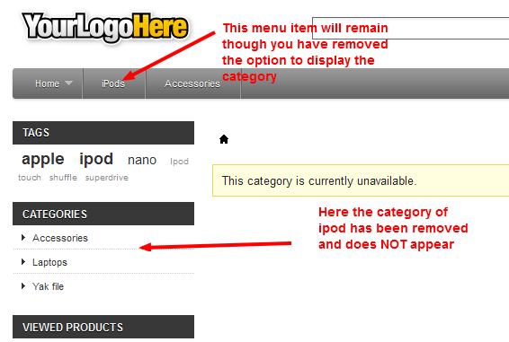 CATEGORIES are the organizational labels that you use to put your shop in order. Make sure that you are naming your categories appropriately so that when the category is displayed, your customers will know how your products are organized. The screenshot below shows the IPODS category as being ENABLED and showing in the CATEGORIES menu along the left side. This is in contrast to the screenshot above where it was removed. The differences in these views summarizes how the CATEGORIES menu is controlled by the CATEGORIES option.