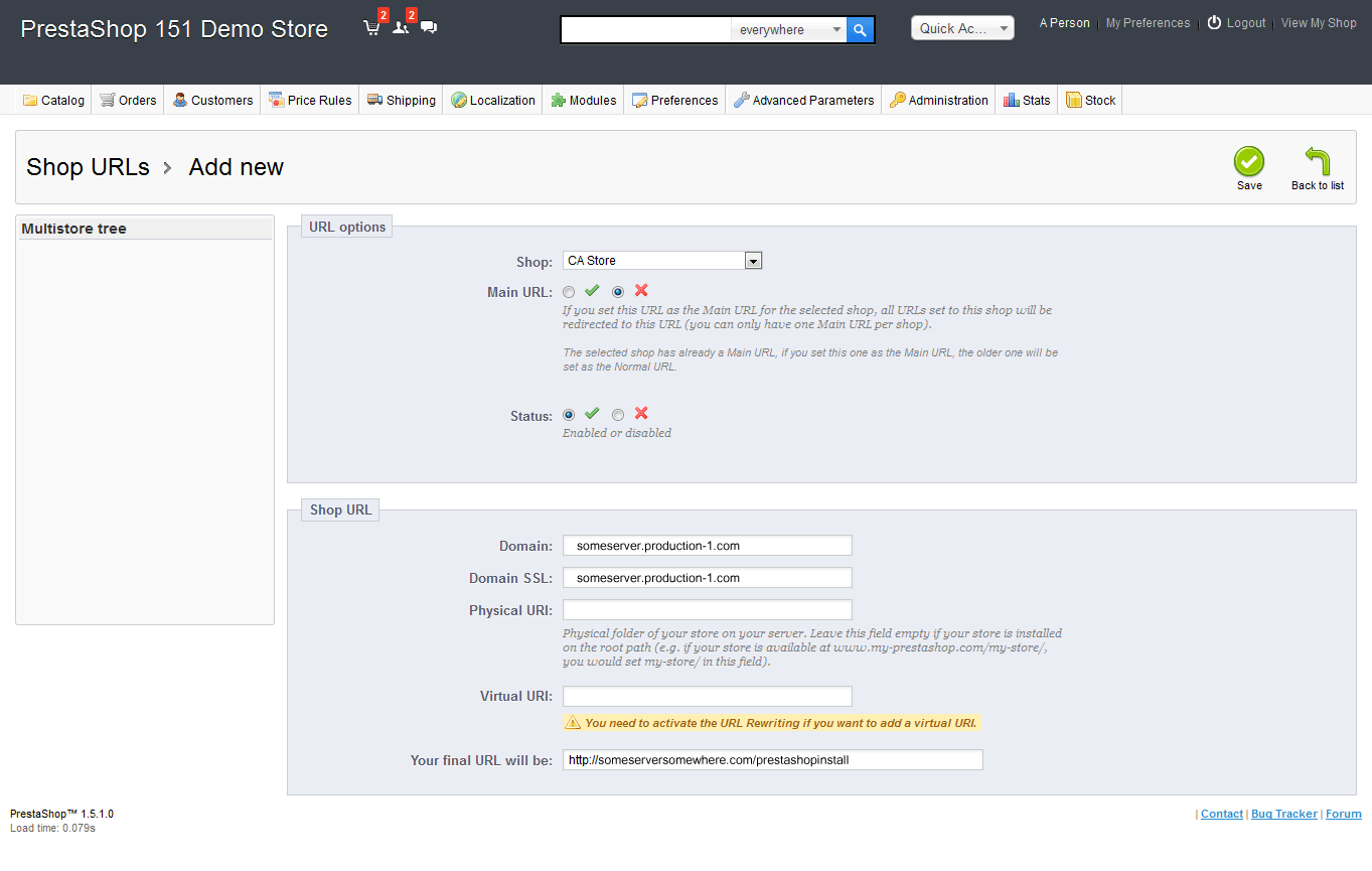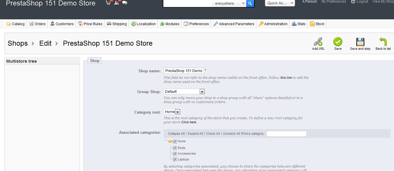 The next step in the process of adding a shop in a PrestaShop Multistore configuration is to set the URL for operation on the internet. This is done after adding a shop, or by editing a shop that is being added. The following article explains how to add the shop URL in PrestaShop 1.5.