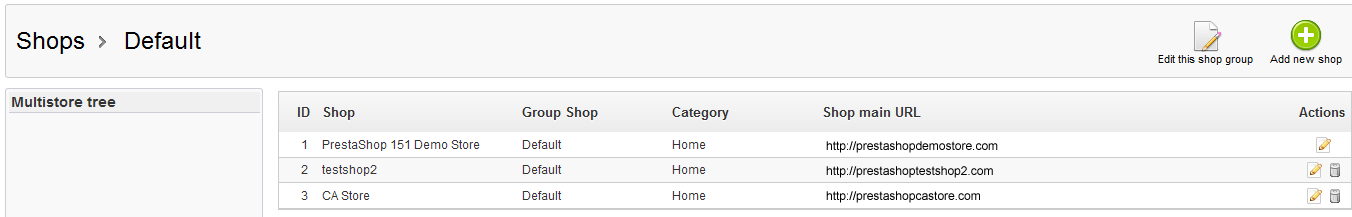 - If you are just adding a new shop then you should go to Adding a Store in MultiStore for PrestaShop 1.5. Otherwise, if you have just saved the store you added, you should see a store list similar to this one: