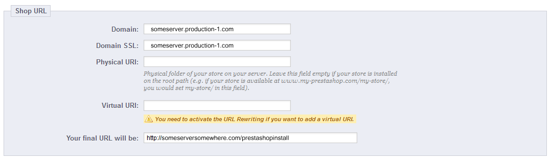 SHOP URL: You are able to specify the domain name used, the domain SSL (if there is one), the physical URI, and a virtual URI. Note that as you build the domain name, the final URL is specified at the bottom. For example: