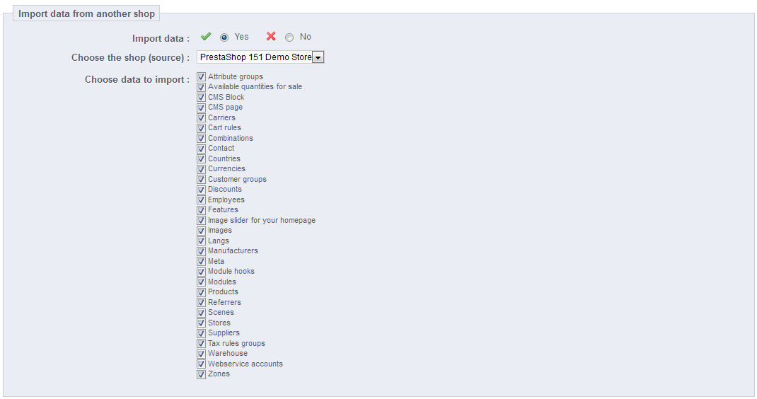 Enable the transfer of data by clicking on the YES or NO radial button. If you intend to transfer data, you will need to choose the source shop from where the data is coming. And then check off the specific data you wish to transfer. Once you have finished selecting the data to import, select the SAVE AND STAY option to initiate the data transfer.