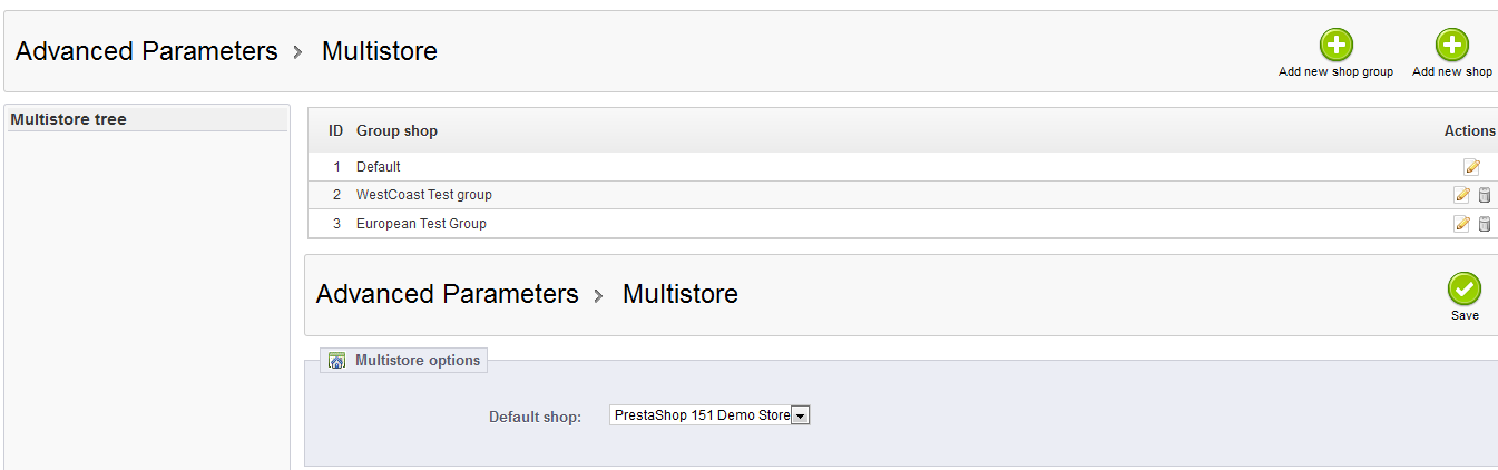 The screen for multistore include the table with the groups listed includes ID, Group Shop (name) and ACTIONS. Then underneath that table there is the option to set the Default shop. To the left, there is a blank area called the MULTISTORE TREE. We unfortunately were not able to get that area to show stores (most likely in a tree-style format). We believe that this will be available in future updates. The main options available here are the