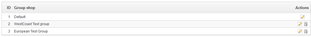 The shop group is a way to unify data between multiple stores being managed by PrestaShop 1.5. It is important to set this option up before the stores start operating in order to accurately account for all data being shared between the stores, including inventory, sales data and customer data. When the group is formed there is no overt difference to the stores as the changes are primarily internal. An administrator would see a list like the following: